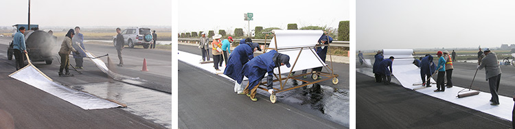 一、聚酯玻纖布必須在熱瀝青上進(jìn)行安裝施工。我們推薦以下的瀝青。AC-20;PG64-22;AR8000; 或者刺入等級(jí)為60-80的瀝青。對(duì)極端高溫的夏季施工,推薦采用粘度比較高的瀝青,以下瀝青比較適合夏季施工:AC-30;PG67-22;AR8000;或者刺如等級(jí)為40-60的瀝青。
